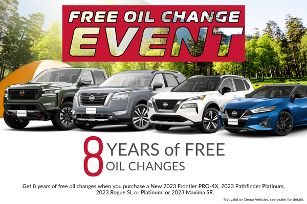 Get 8 years of FREE oil changes when you purchase a new 2023 Frontier PRO-4X, 2023 Pathfinder Platinum, 2023 Rogue SL/ Platinum or 2023 Maxima SR. Fore more details, please contact West Coast Nissan.