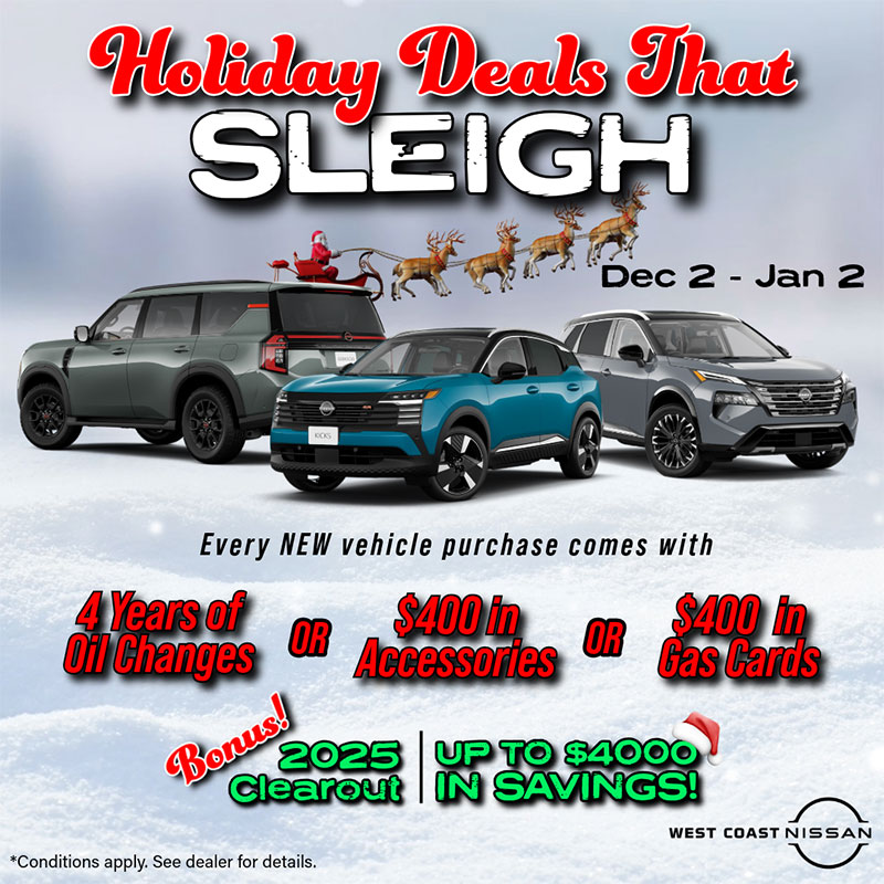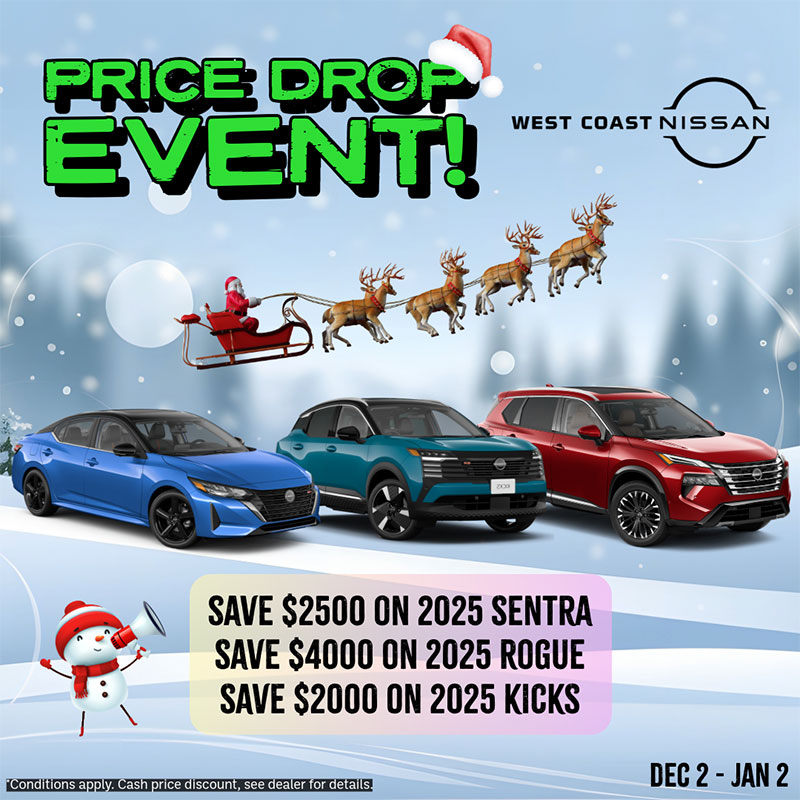 Save $2,000 on the 2025 Kicks, $2,500 on the 2025 Sentra and $4,000 on the 2025 Rogue until January 2nd. Cash purchase bonus. Conditions apply; see dealer for details.