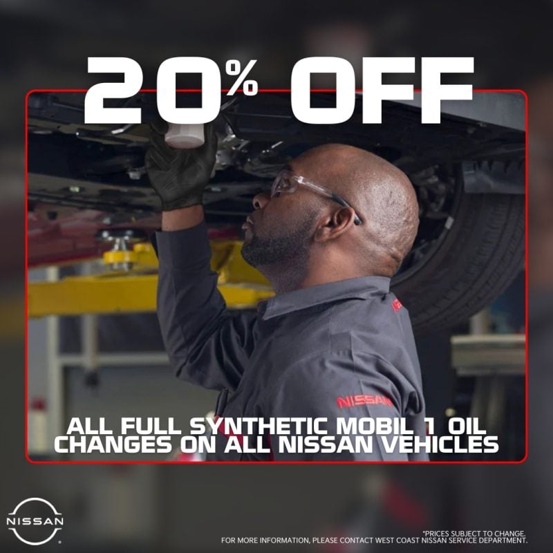 Receive 20% off all full synthetic Mobil 1 oil changes on all Nissan vehicles with West Coast Nissan. *While supplies last. Service required. Prices subject to change. For more information, please contact West Coast Nissan service department.