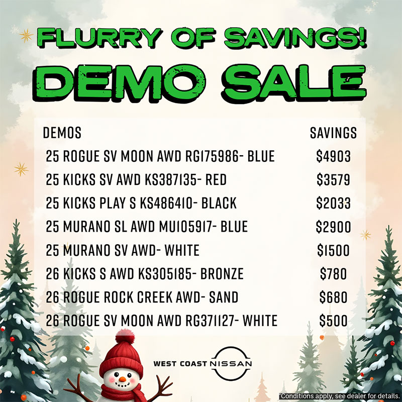 Save $2,000 on the 2025 Kicks, $2,500 on the 2025 Sentra and $4,000 on the 2025 Rogue until January 2nd. Cash purchase bonus. Conditions apply; see dealer for details.