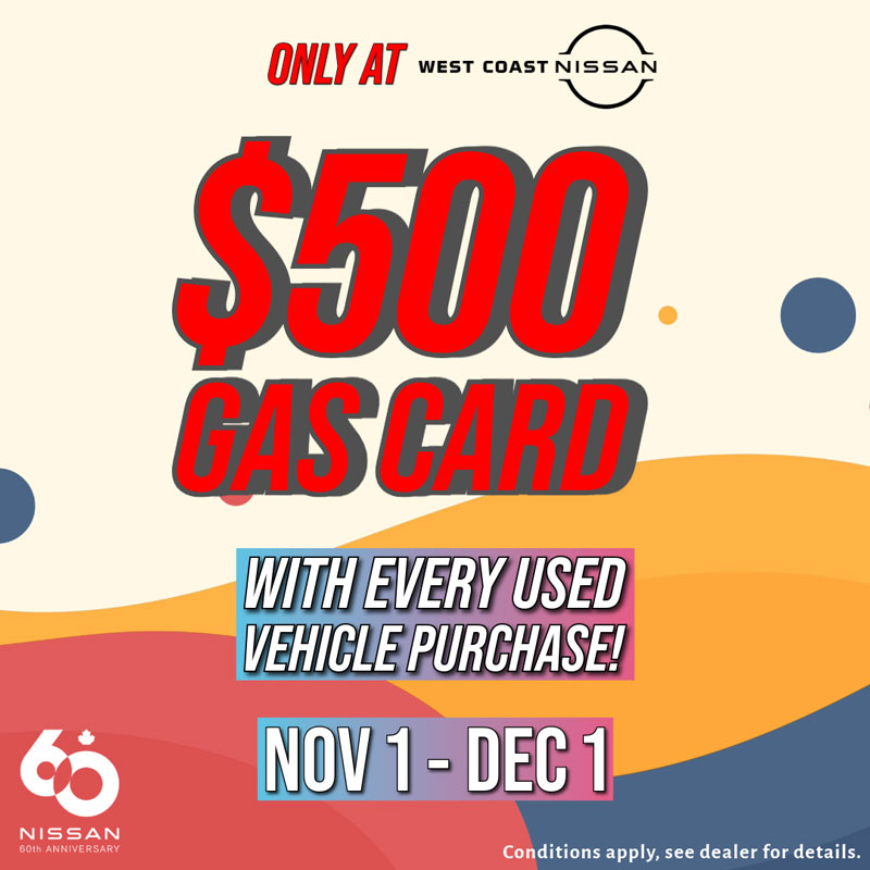 From now until December 1st, take home any Used Vehicle from West Coast Nissan and we’ll include a $500 Gas Card to keep you fueled up for the road ahead.
