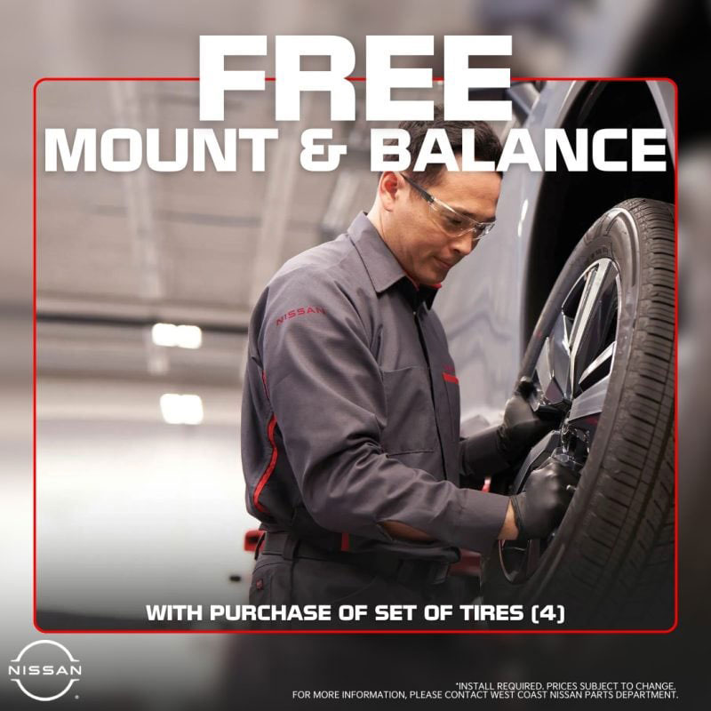 Receive a FREE mount & balance when purchasing a new set of tires for your vehicle with West Coast Nissan.