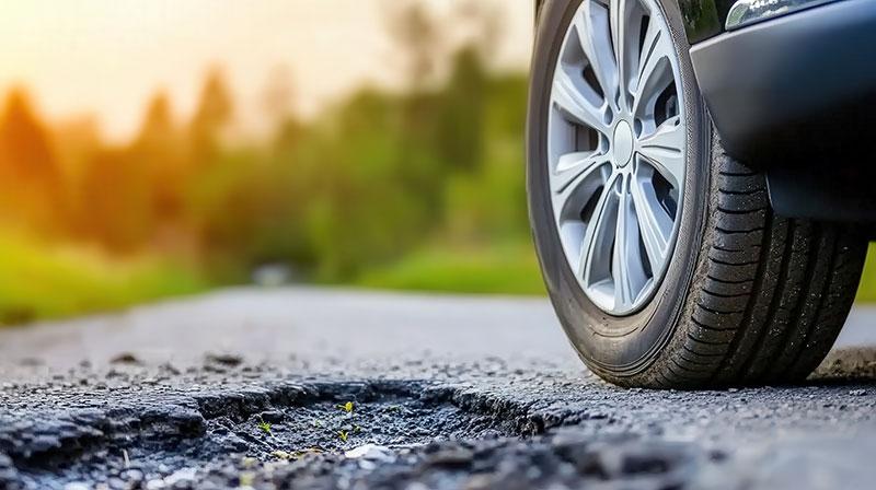 Low-profile tires are especially vulnerable. A pothole can cause sidewall bulges, internal belt separation, or bent alloy rims that create vibration at highway speeds.